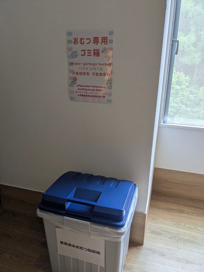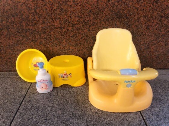 ベビーソープ、ベビーバスチェア、脱衣所にはベビーベッドが完備されていました。