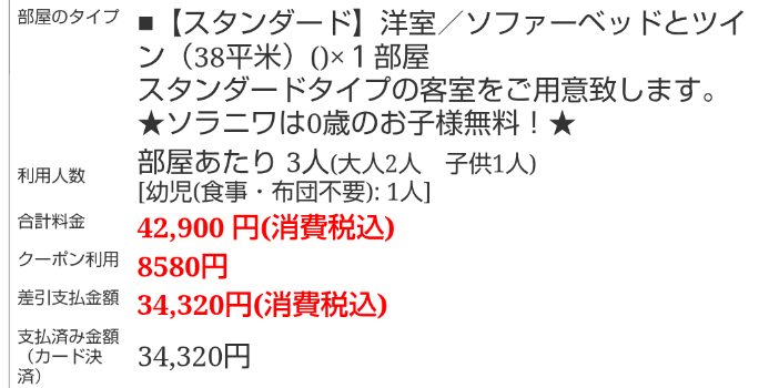 宿泊料は本来42,990円でしたが、楽天トラベルのクーポンが適応され34,320円で宿泊できました!